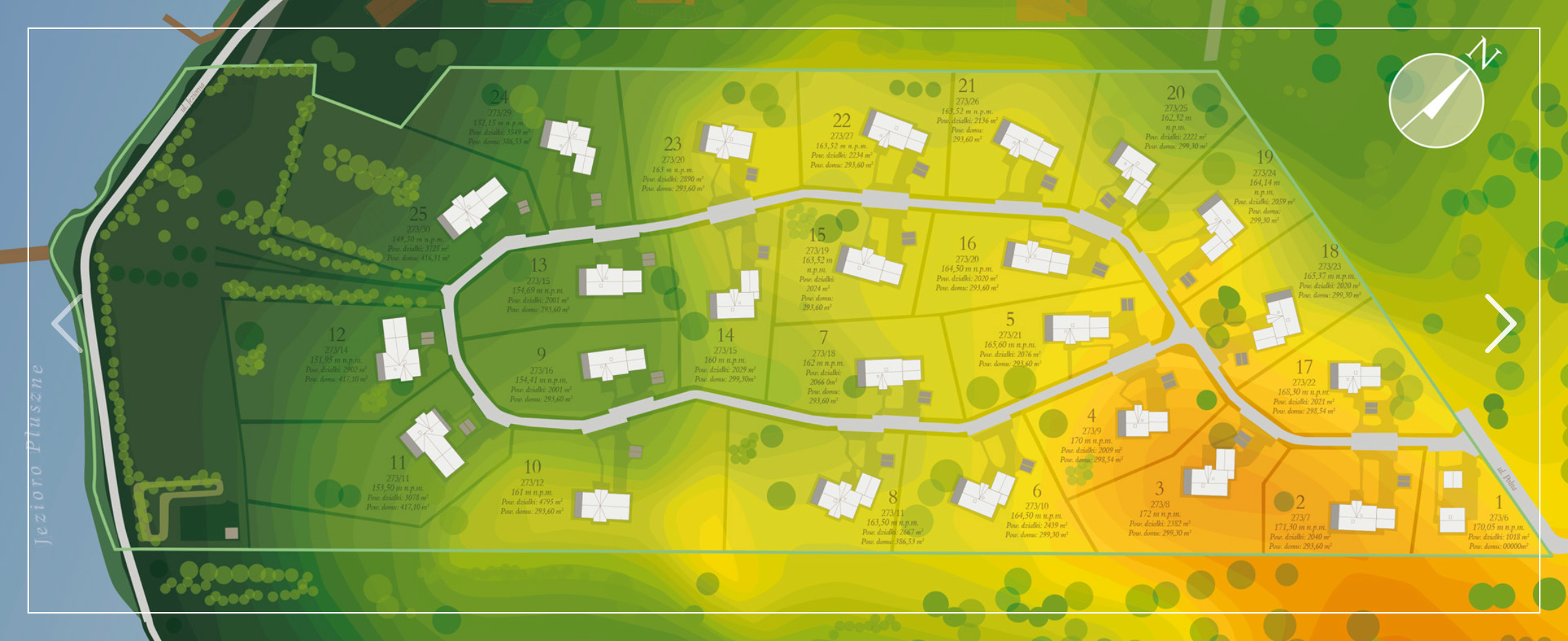24 - w większości zadrzewionych posesji o zróżnicowanym ukształtowaniu terenu o powierzchniach od 2 do 4 tysięcy mkw każda;
